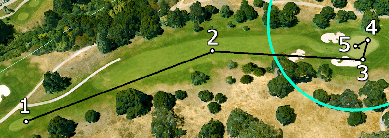 いわゆる2オン、2パット、または3打目を寄せて1パットで締めるパターン。下の図では、青い園内がピンから100ヤード圏内を示します。